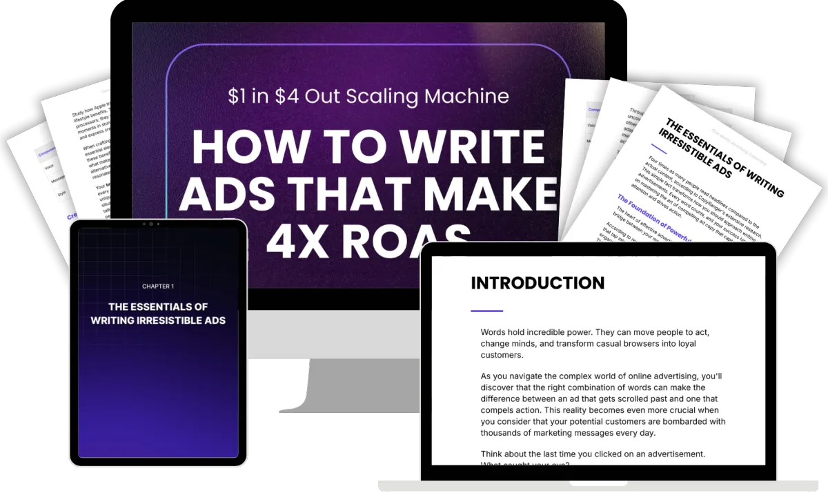 You get immediate access to our complete ad copy system based on proven psychological principles. This includes the audience understanding framework, headline crafting formulas, AIDA model implementation, and scientific testing protocols. All modules come with practical examples and step-by-step guidelines as outlined in the book to help you achieve 4X ROAS consistently.